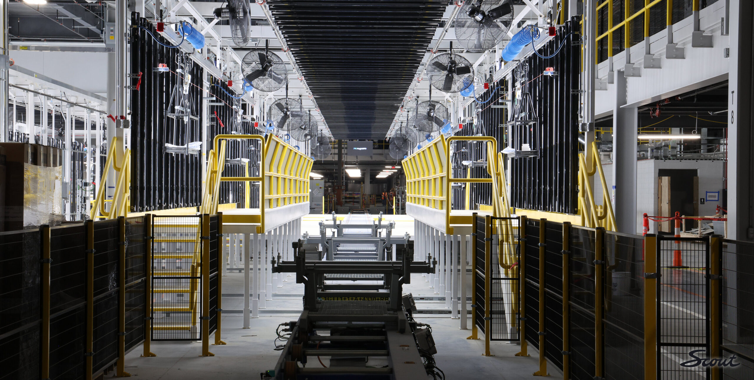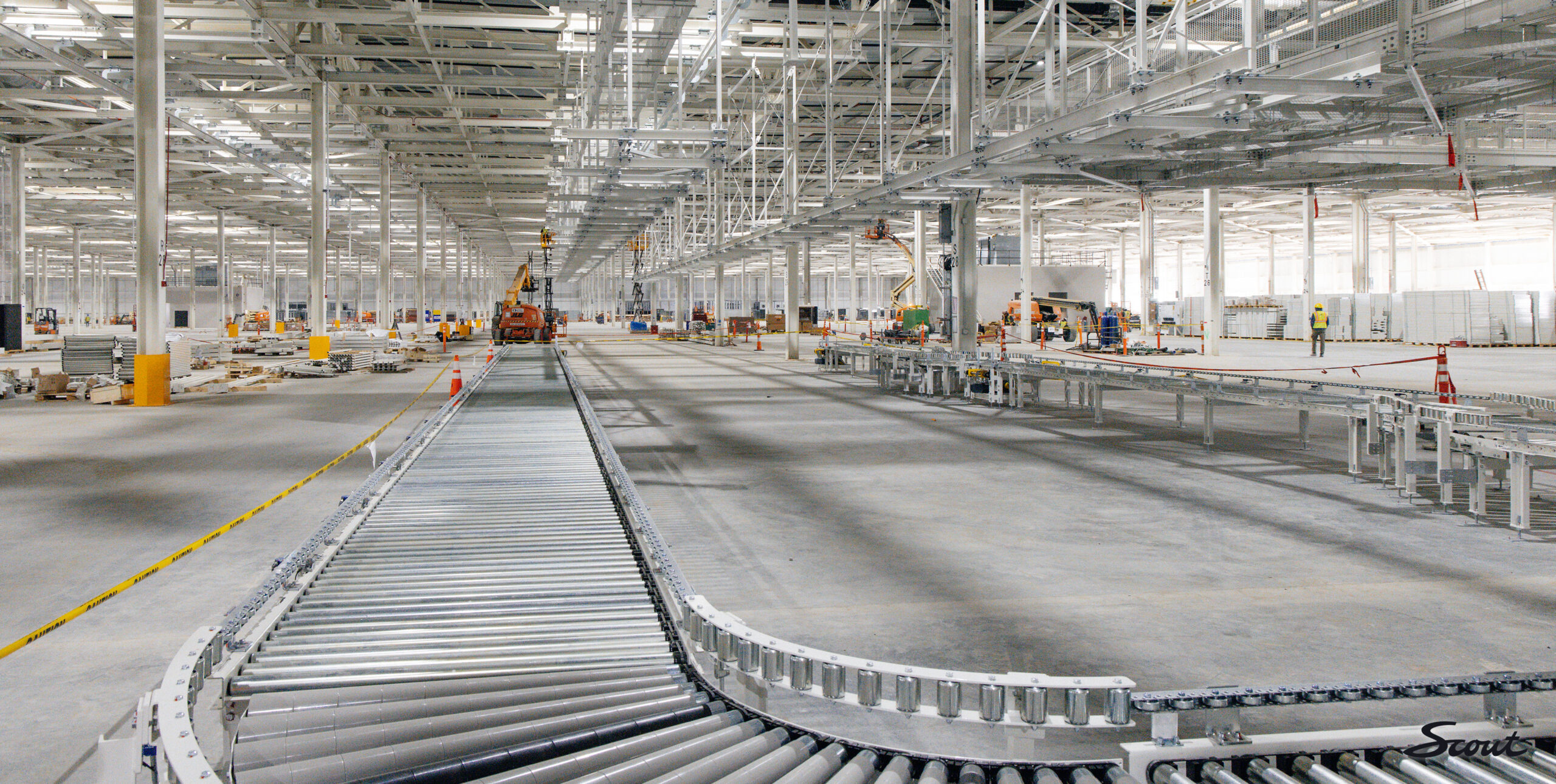 The Assembly Hall (above) interior progress is picking up significantly. Mezzanine level steel is going up rapidly to help support supply chain mechanisms. Likewise, roller systems that feed supplies to the assembly line are going in at ground level.
