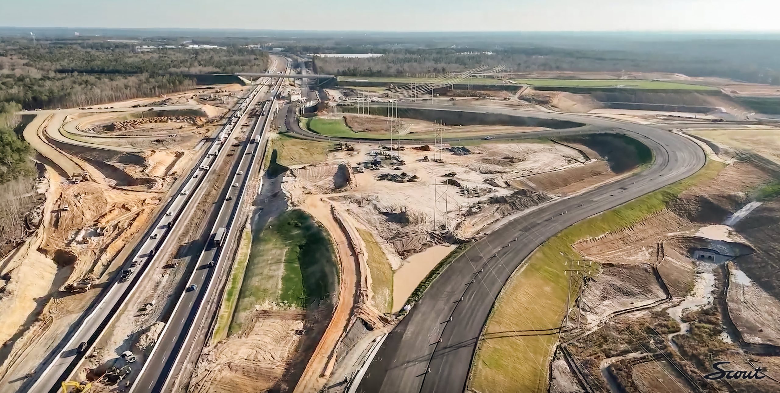 Below you can see progress being made on the Scout Motors interchange to Highway 77, which will help steer Scout Production Center traffic and deliveries directly to the factory, easing congestion at the Blythewood exit.