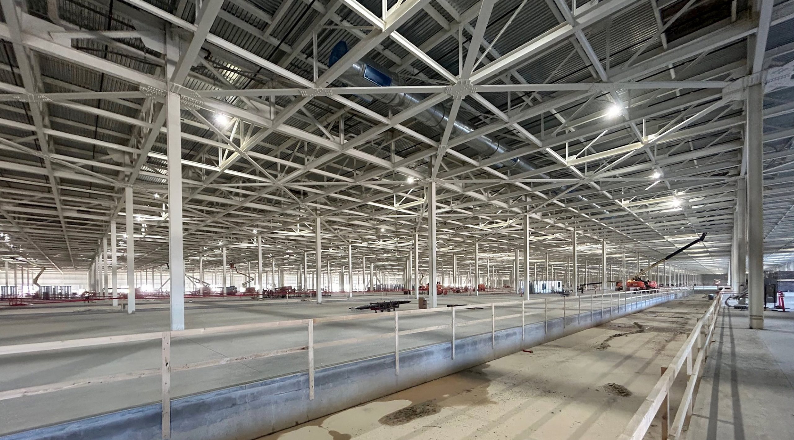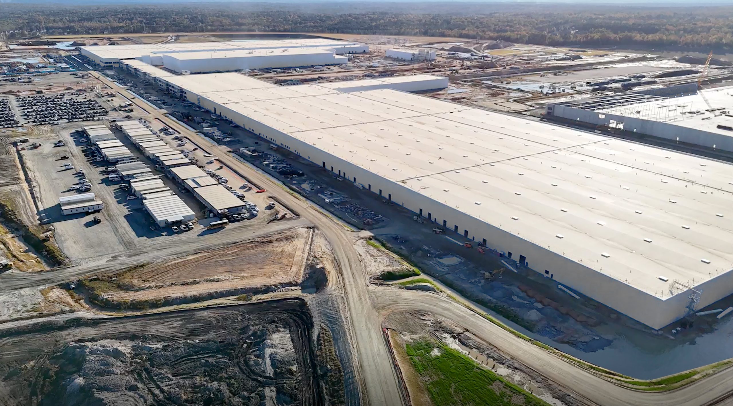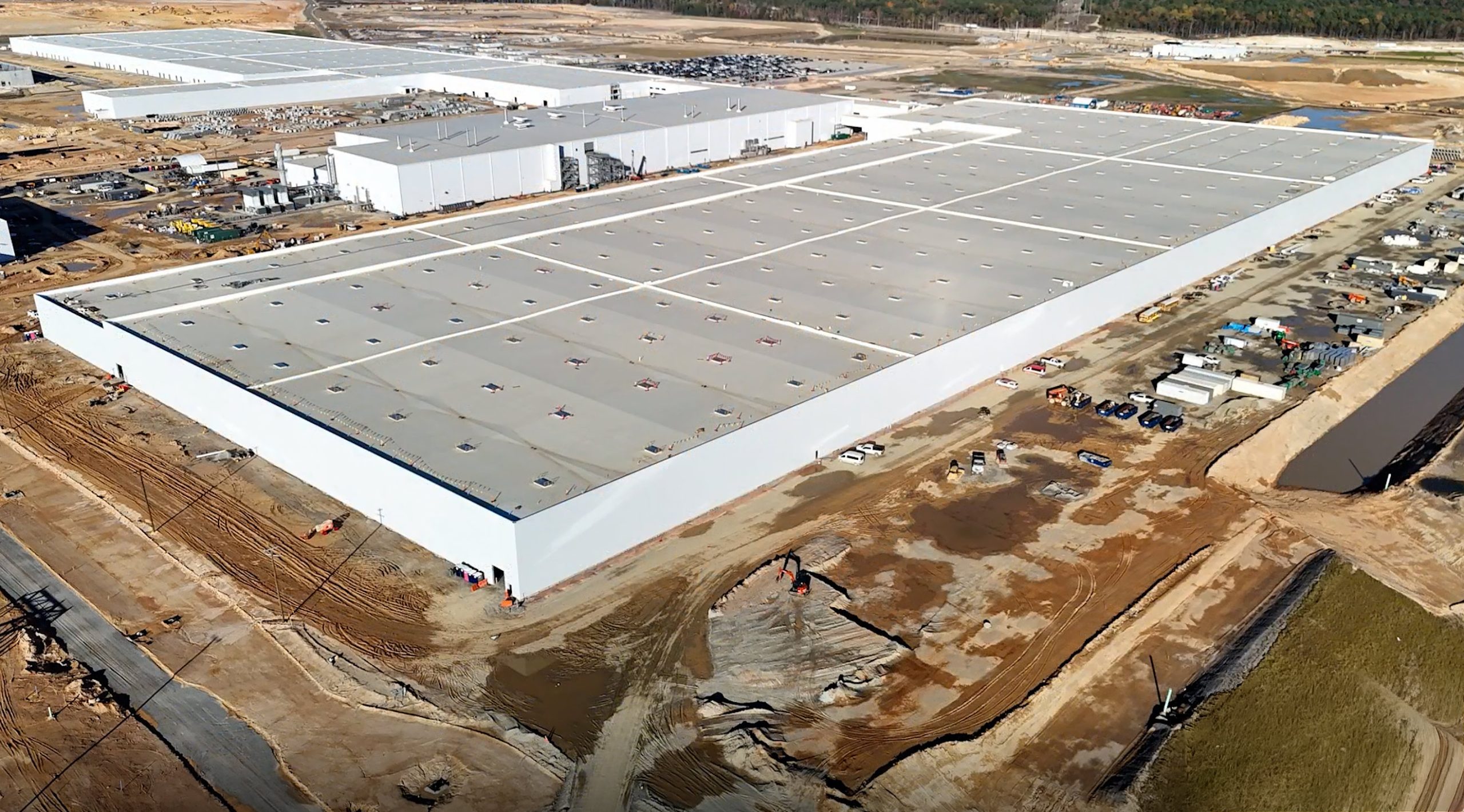 (BELOW) You get a sense of the scale of the assembly building in the photo below. Crews are have made significant progress on assembly line foundations and HVAC.